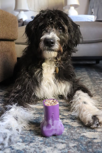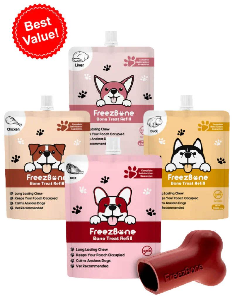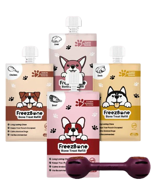 Freezbone is a frozen treat-filled chew toy for dogs that helps relieve stress and anxiety. It also promotes positive chewing behavior, made of natural rubber, non-toxic materials and can be reused multiple times.